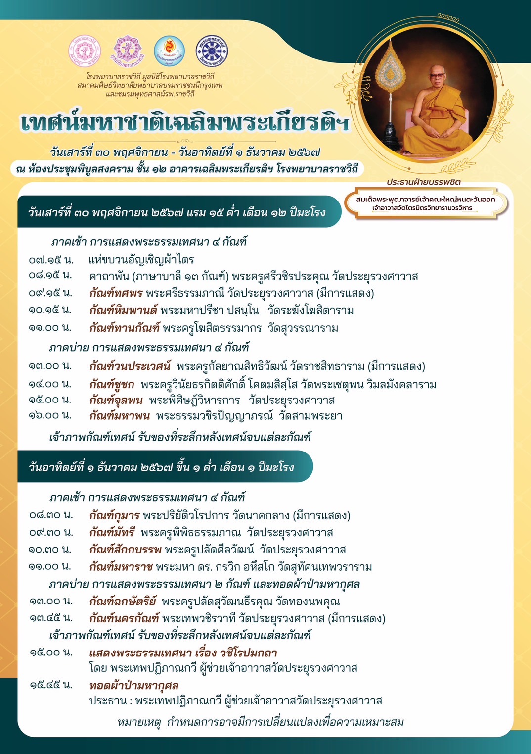 โรงพยาบาลราชวิถี กรมการแพทย์งาน “เทศน์มหาชาติ” 13 กัณฑ์ 1,000 พระคาถา เฉลิมพระเกียรติพระบาทสมเด็จพระเจ้าอยู่หัว ในโอกาสมหามงคลเฉลิมพระชนมพรรษา 6 รอบ 72 พรรษา ในวันที่ 30 พฤศจิกายน – วันอาทิตย์ที่ 1 ธันวาคม 2567 ณ ห้องประชุมพิบูลสงคราม ชั้น 12 อาคารเฉลิมพระเกียรติฯ โรงพยาบาลราชวิถี