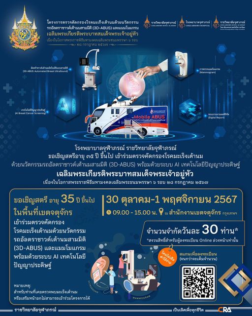 โรงพยาบาลจุฬาภรณ์ ราชวิทยาลัยจุฬาภรณ์ ขอเชิญสตรีอายุ 35 ปีขึ้นไป เข้าร่วมตรวจคัดกรองโรคมะเร็งเต้านม ด้วยนวัตกรรมรถอัลตราซาวด์เต้านมสามมิติ (3D-ABUS) พร้อมด้วยระบบ AI เทคโนโลยีปัญญาประดิษฐ์ เฉลิมพระเกียรติพระบาทสมเด็จพระเจ้าอยู่หัว เนื่องในโอกาสพระราชพิธีมหามงคลเฉลิมพระชนมพรรษา 6 รอบ 28 กรกฎาคม 2567