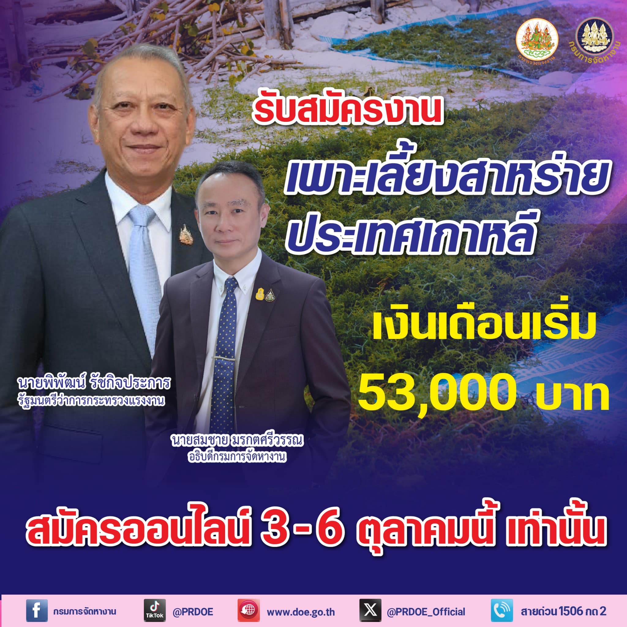 กระทรวงแรงงาน โดยกรมการจัดหางาน เปิดรับสมัครคนงานชายอายุ 30-40 ปี เพื่อไปทำงานภาคประมงตามฤดูกาล ตำแหน่ง เพาะเลี้ยงสาหร่ายทะเล รายได้ 5.3 หมื่นบาท สัญญา 5 เดือน ขยายเวลาเพิ่มอีก 3 เดือน สมัครด่วน 3-6 ตุลาคมนี้ ที่เว็บไซต์ toea.doe.go.th
