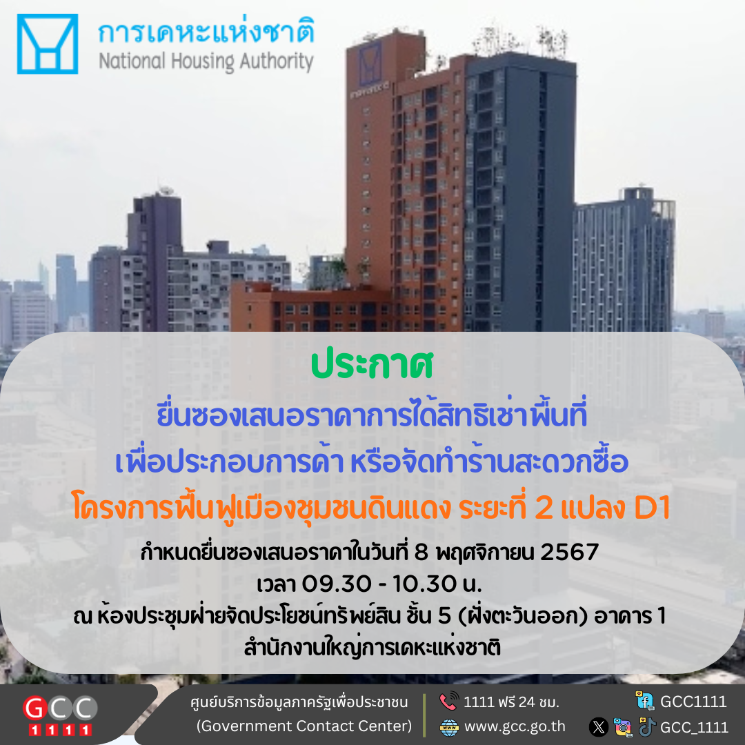 ประกาศการเคหะแห่งชาติ เปิดให้ยื่นซองเสนอราคาการได้สิทธิเช่าพื้นที่เพื่อประกอบการค้า หรือจัดทําร้านสะดวกซื้อในโครงการฟื้นฟูเมืองชุมชนดินแดง ระยะที่ 2 แปลง D1 กําหนดยื่นซองเสนอราคาในวันที่ 8 พฤศจิกายน 2567 เวลา 09.30 – 10.30 น ณ ห้องประชุมฝ่ายจัดประโยชน์ทรัพย์สิน ชั้น 5 (ฝั่งตะวันออก) อาคาร 1 สํานักงานใหญ่การเคหะแห่งชาติ กําหนดเปิดซองเสนอราคาในวันเดียวกัน ตั้งแต่ 10.45 น เป็นต้นไป