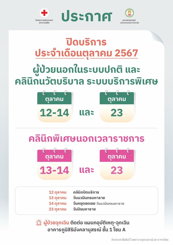 โรงพยาบาลจุฬาลงกรณ์ สภากาชาดไทย แจ้งวันปิดให้บริการประจำเดือน ตุลาคม 2567