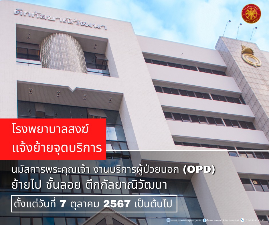 โรงพยาบาลสงฆ์ แจ้งย้ายจุดบริการ นมัสการพระคุณเจ้าและผู้มารับบริการ งานบริการผู้ป่วยนอก (OPD) ตั้งแต่วันที่ 7 ตุลาคม 2567 เป็นต้นไป โดยย้ายไป ชั้นลอย ตึกกัลยาณิวัฒนา