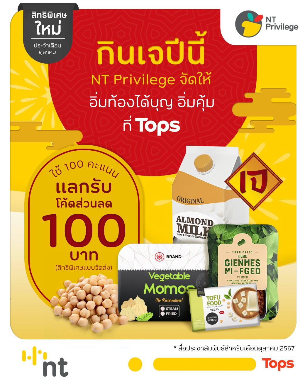 เริ่มแล้ว เทศกาลกินเจ 2567 NT Privilege จัดให้ อิ่มท้องได้บุญ อิ่มคุ้มที่ Tops เลือกเมนูโปรดได้ตามใจ อยากกินเมนูไหนก็มีส่วนลด เฉพาะสมาชิก NT Privilege ใช้ 100 คะแนน แลกรับส่วนลด Tops 100 บาท (สิทธิพิเศษแบบจัดส่ง) รับสิทธิ์ คลิกเลย https://bit.ly/4dqaYaC