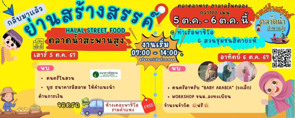 สำนักงานเขตสะพานสูง เชิญเที่ยว “ตลาดน้ำสะพานสูง” เดือนตุลาคม ในวันที่ 5 – 6 ตุลาคม 2567 ณ สวนชุมชนฮิดายะห์พัฒนา ซอยรามคำแหง 127/2