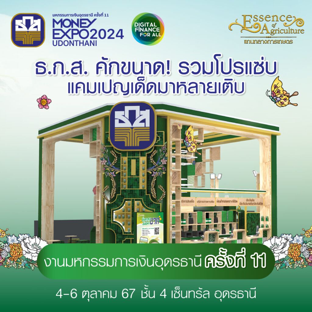 ธนาคารเพื่อการเกษตรและสหกรณ์การเกษตร จัดโปรโมชั่นในงานมหกรรมการเงินอุดรธานี Money Expo Udonthani 2024 ระหว่างวันที่ 4 – 6 ตุลาคม 2567 ณ อุดรธานีฮอลล์ ชั้น 4 เซ็นทรัล อุดรธานี โดยบัตรเดบิตใหม่ 3 สไตล์ ที่มาพร้อมกับประกันอุบัติเหตุ เลือกความคุ้มครองและสิทธิประโยชน์ได้ถึง 3 ระดับ พร้อมกับเอาใจวัยเลอค่ากับเงินฝากแก้วนพรัตน์ และเงินฝากพลอยน้ำงาม ฝาก 1 แสน รับดอกเบี้ยทุกเดือน สูงสุดถึง 2.10% ต่อปี หรือ ธกส HUG 10/5 ส่งชำระ 5 ปี คุ้มครอง 10 ปี พร้อมรับเงินคืนทุกปี และรับผลประโยชน์รวมสูงสุดถึง 582% พิเศษ เมื่อฝากเงินบัญชีออมทรัพย์ตั้งแต่ 58,000 บาทขึ้นไป คงยอดไว้ 3 เดือน รับฟรีสิทธิ์ จุ่มมังแมว 1 สิทธิ์ หรือฝากสลาก 5 แสนบาทขึ้นไป รับมังแมวครบเซ็ต และเลือกช็อปผลิตภัณฑ์ลูกค้า ธ.ก.ส. A-Product และสินค้าจากโครงการ New Gen ฮักบ้านเกิด Season 2 อีกมากมายได้ที่บูธ ธ.ก.ส. *เงื่อนไขเป็นไปตามที่ธนาคารกำหนด