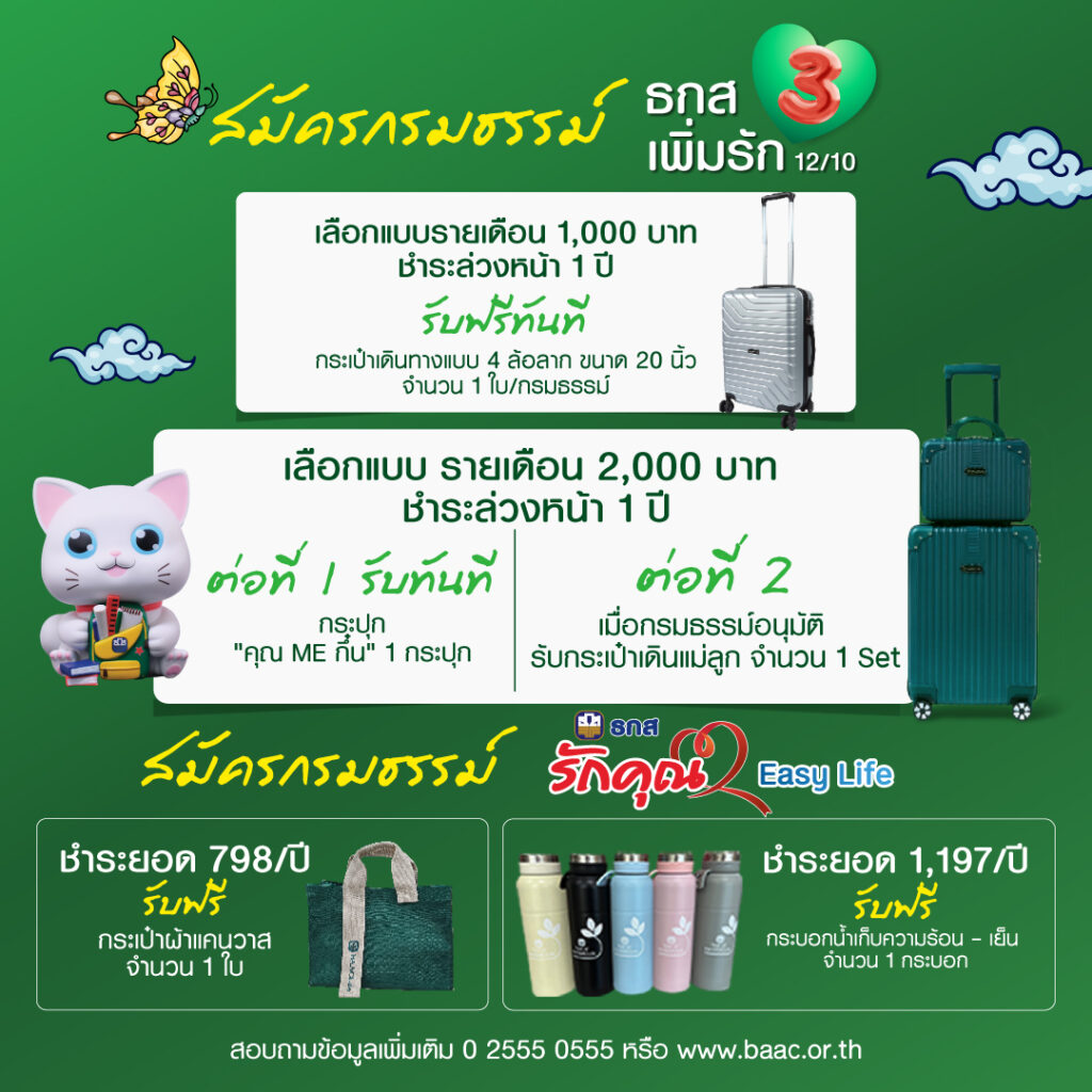 นอกจากนี้ ธ.ก.ส. ยังได้จัดบริการเงินฝากใหม่ที่ให้ผลตอบแทนสูง ทั้งเงินฝากแก้วนพรัตน์ สำหรับผู้เกษียณอายุ หรือ Early Retire ภายในปี 2567 และบุคคลธรรมดาที่อายุ 55 ปีขึ้นไป เปิดฝากขั้นต่ำ 100,000 บาท ไม่จำกัดวงเงินรับฝากสูงสุด ระยะเวลา 3 ปี รับดอกเบี้ยเป็นรายเดือนร้อยละ 2.10 ต่อปี เงินฝากพลอยน้ำงาม สำหรับผู้ที่อายุ 50 ปีขึ้นไป ฝากขั้นต่ำ 100,000 บาท ไม่จำกัดวงเงินรับฝาก ระยะ 3 ปี รับดอกเบี้ยรายเดือนร้อยละ 2.05 ต่อปี โดยเปิดรับฝากแล้วตั้งแต่วันนี้ จนถึง 31 ตุลาคม 2567 หรือจนกว่าจะรับฝากเต็มวงเงิน ส่วนผู้ที่กำลังมองหาผลิตภัณฑ์เงินฝากที่ให้ทั้งผลตอบแทนที่ดี ไปพร้อมกับการวางแผนการลดหย่อนภาษี และความคุ้มครองชีวิต สามารถเลือกใช้บริการผลิตภัณฑ์ที่มาพร้อมโปรโมชันพิเศษมากมาย อาทิ ธกส HUG 10/5 สำหรับเกษตรกรหรือครอบครัวเกษตรกร อายุ 20 – 65 ปีบริบูรณ์ ที่มีสุขภาพร่างกายแข็งแรงสมบูรณ์ ฝากเริ่มต้น 10,000 บาท สูงสุดไม่เกิน 2 ล้านบาทต่อราย ระยะเวลาส่งชำระ 5 ปี และระยะเวลาคุ้มครอง 10 ปี ซึ่งลูกค้าจะได้รับผลประโยชน์รวมตลอดสัญญากว่า 582% ของเงินทุนสงเคราะห์ พิเศษ! โปรโมชันเปิดตัว “ธกส HUG (ฮัก) 10/5 อุ่นใจ ได้เงินคืน” สำหรับลูกค้าใหม่ที่ฝากเงินตั้งแต่ 10,000 บาทขึ้นไป และได้รับการอนุมัติกรมธรรม์จะได้รับเงินคืนรวมสูงสุด 3% ของจำนวนเงินที่ส่งชำระปีแรก ทั้งนี้ มูลค่าเงินคืนรวมไม่เกิน 5 ล้านบาท ระยะเวลาโปรโมชันตั้งแต่วันนี้จนถึง 31 ธันวาคม 2567 หรือเมื่อสมัครกรมธรรม์ ธกส รักคุณ Easy Life และชำระยอด 1,197 บาทต่อปี รับฟรี กระบอกน้ำเก็บความร้อน – เย็น หรือเมื่อสมัครกรมธรรม์ ธกส เพิ่มรัก3 12/10 และชำระล่วงหน้า 1 ปี (11,520 บาท) รับเลยกระเป๋าเดินทางแบบ 4 ล้อลาก ขนาด 20 นิ้ว จำนวน 1 ใบ/กรมธรรม์ หรือเลือกชำระรายเดือน 2,000 บาท และชำระล่วงหน้า 1 ปี จำนวน 23,040 บาท ต่อที่ 1 รับกระปุกคุณ ME กึ๋น และต่อที่ 2 เมื่อกรมธรรม์อนุมัติ รับเลยกระเป๋าเดินทางแม่-ลูก จำนวน 1 เซ็ต
