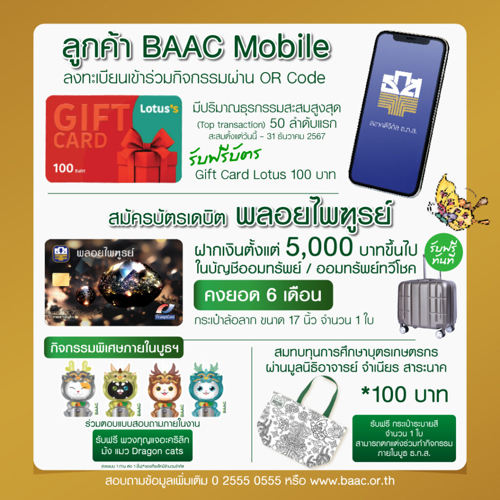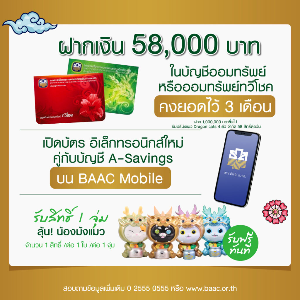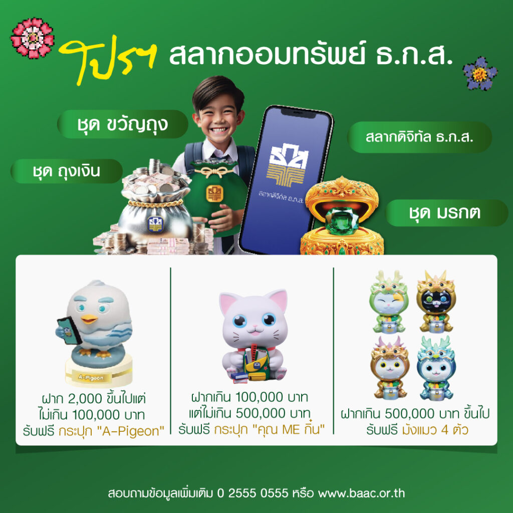 พิเศษ เมื่อฝากสลากออมทรัพย์ทวีสิน ชุดมรกต สลากออมทรัพย์ ธ.ก.ส. ชุดถุงเงิน ชุดขวัญถุง และสลากดิจิทัล ธ.ก.ส. ตั้งแต่ 2,000 บาทขึ้นไป แต่ไม่เกิน 100,000 บาท รับฟรีกระปุก A-Pigeon หรือฝาก 100,000 – 500,000 บาท รับฟรี กระปุก คุณ ME กึ๋น และฝากเกิน 500,000 บาทขึ้นไป รับฟรีอาร์ตทอยมังแมวสุดน่ารัก 4 ตัว นอกจากนี้ เมื่อฝากเงินบัญชีออมทรัพย์หรือออมทรัพย์ทวีโชค ตั้งแต่ 58,000 บาทขึ้นไป และคงยอดเงินไว้ 3 เดือน หรือเปิดบัญชี A-Savings คู่กับบัตรอิเล็กทรอนิกส์บนแอปพลิเคชัน BAAC Mobile ลุ้นรับสิทธิ์จุ่ม มังแมว 1 ตัว หรือเมื่อสะสมยอดการทำธุรกรรมบนแอปพลิเคชัน BAAC Mobile สะสมสูงสุด 50 ลำดับแรก ตั้งแต่วันนี้จนถึง 31 ธันวาคม 2567 รับฟรี! บัตรของขวัญโลตัส มูลค่า 100 บาท (เงื่อนไขเป็นไปตามที่ธนาคารกำหนด)