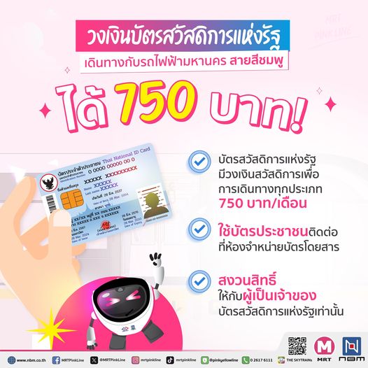 รถไฟฟ้ามหานคร สายสีชมพู แนะนำบัตรสวัสดิการแห่งรัฐ มีวงเงินสวัสดิการเพื่อการเดินทางทุกประเภท 750 บาท/เดือน ผู้โดยสารสามารถใช้บัตรประชาชนใบเดียว ติดต่อที่ห้องจำหน่ายบัตรโดยสารทุกสถานี และมีรายละเอียดดังนี้ครับ