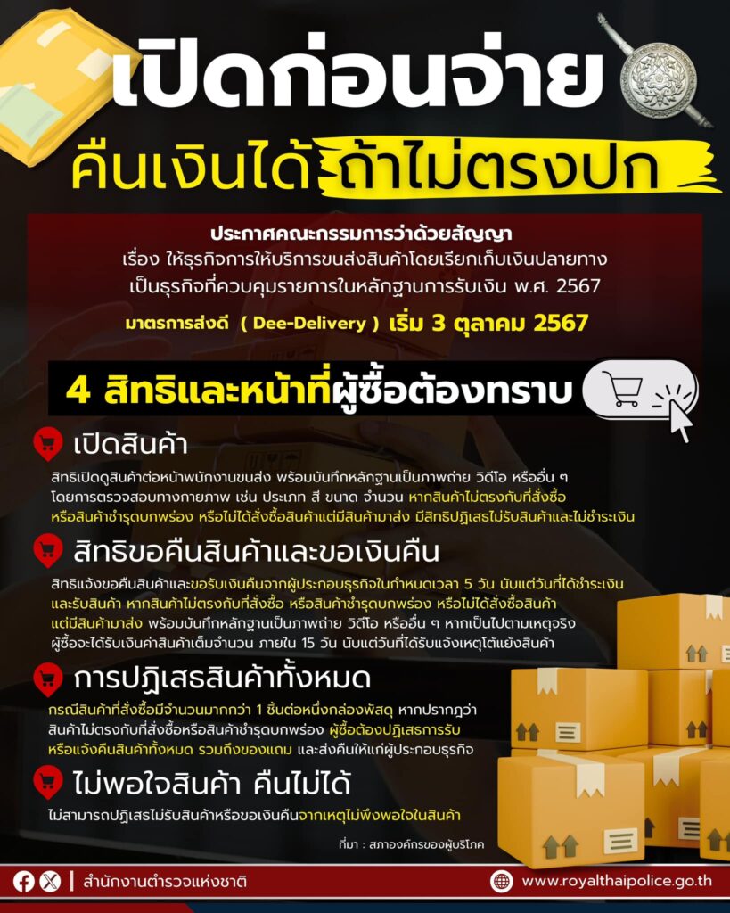 สำนักงานตำรวจแห่งชาติ แนะนำ ช้อปออนไลน์ เปิดก่อนจ่าย คืนเงินได้ ถ้าไม่ตรงปก มาตรการส่งดี มีผลบังคับใช้ตั้งแต่ 3 ตุลาคม 2567