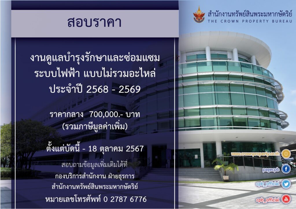 สำนักงานทรัพย์สินพระมหากษัตริย์ เปิดสอบราคางานดูแลบำรุงรักษาและซ่อมแซมระบบไฟฟ้า ฯ ประจำปี 2568 – 2569