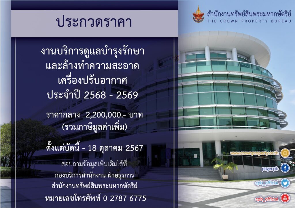 สำนักงานทรัพย์สินพระมหากษัตริย์ เปิดประกวดราคางานบริการดูแลบำรุงรักษาและล้างทำความสะอาดเครื่องปรับอากาศฯ