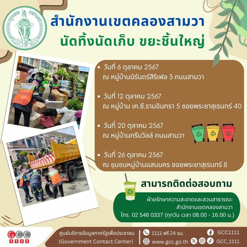 โดยประชาชนท่านใด มีความประสงค์จะทิ้งขยะชิ้นใหญ่ เฟอร์นิเจอร์ เครื่องใช้ไฟฟ้า เครื่องเรือนเก่าหรือมีสภาพชำรุด #ขยะอันตราย หลอดไฟ แบตเตอรี่ บรรจุภัณฑ์อันตรายต่าง ๆ เศษกิ่งไม้ ใบไม้ ใบหญ้า สามารถติดต่อสอบถาม ได้ทางฝ่ายรักษาความสะอาดและสวนสาธารณะ สำนักงานเขตคลองสามวา หมายเลขโทรศัพท์ 0 2548 0337 (ทุกวัน เวลา 08.00 – 16.00 น.)