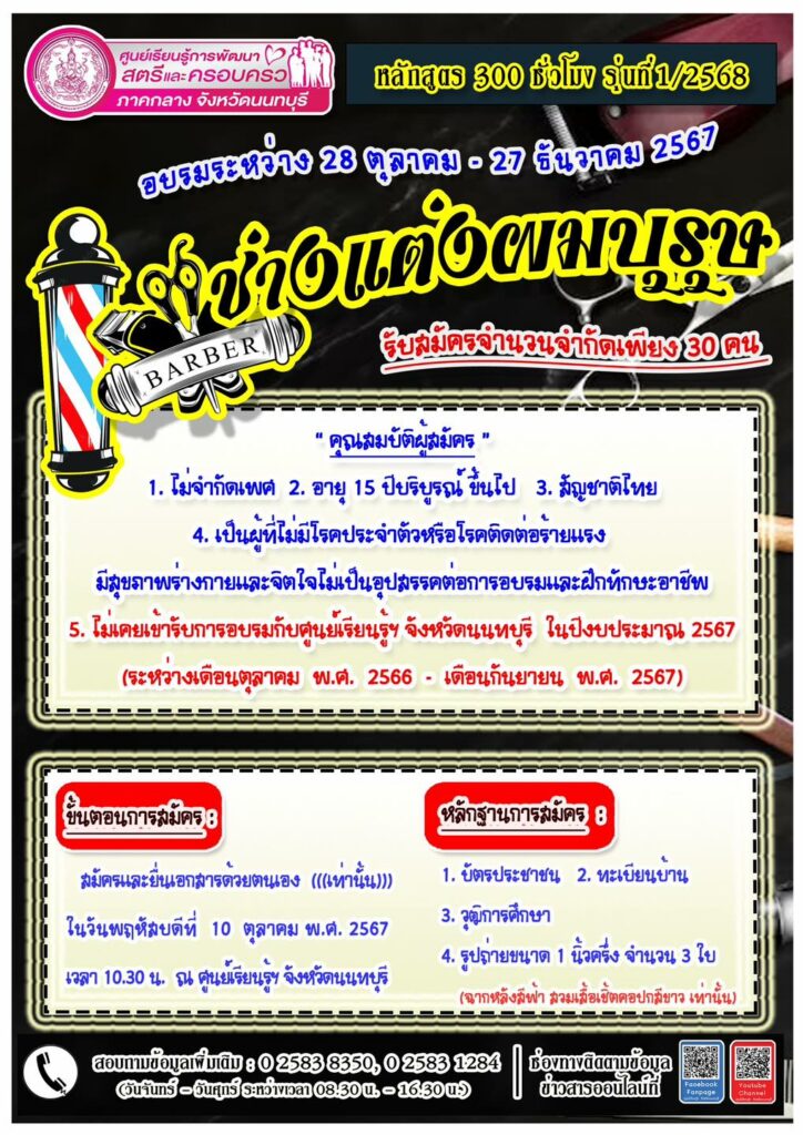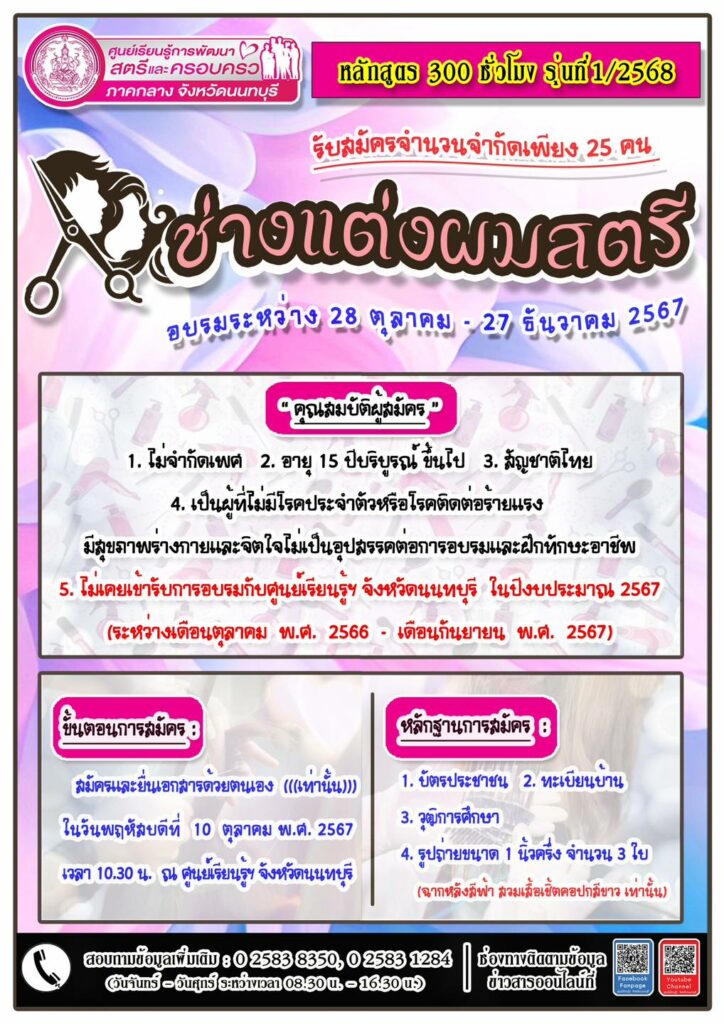 - ศูนย์เรียนรู้การพัฒนาสตรีและครอบครัวภาคกลาง จังหวัดนนทบุรี เปิดรับสมัครหลักสูตร 300 ชั่วโมง รุ่นที่ 1 ประจำปีงบประมาณ 2568