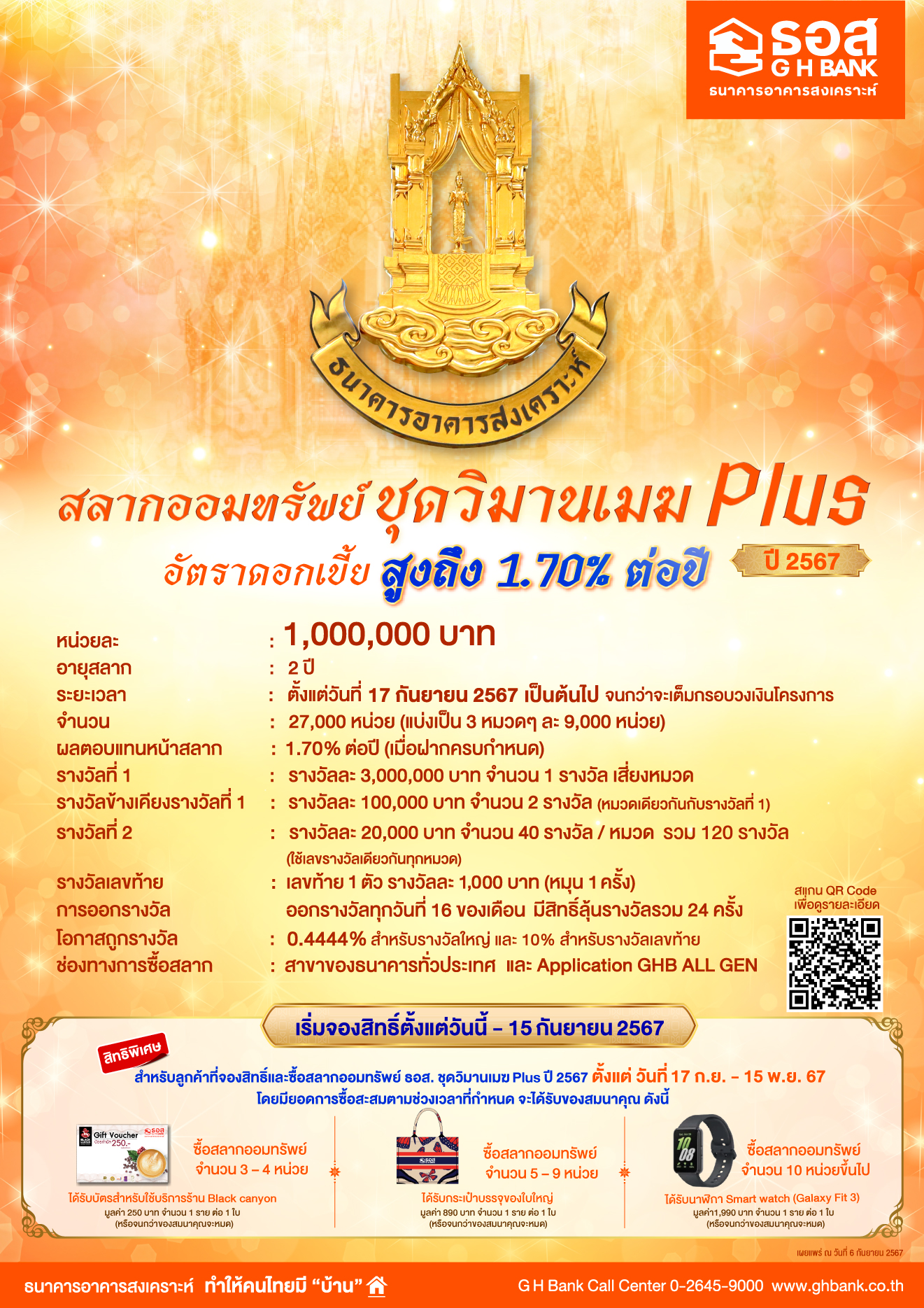 โดยคิดเป็นโอกาสในการถูกรางวัลใหญ่สูงถึง 0.4444% ดอกเบี้ยและเงินรางวัลไม่ถูกหักภาษี ณ ที่จ่าย พิเศษสุด! สำหรับลูกค้าที่จองสิทธิ์ซื้อสลากออมทรัพย์ ธอส. ชุดวิมานเมฆ Plus ปี 2567 ตั้งแต่วันนี้ถึงวันที่ 15 กันยายน 2567 และซื้อสลากตั้งแต่วันที่ 17 กันยายน – 15 พฤศจิกายน 2567 จะได้รับของสมนาคุณ เช่น Gift Voucher Black canyon มูลค่า 250 บาท Smart watch มูลค่า 1,990 บาท โดยมีเงื่อนไขเป็นไปตามที่ธนาคารกำหนด