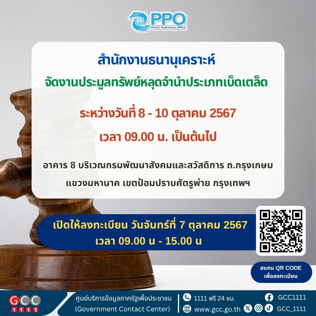 สธค. โรงรับจำนำของรัฐ จัดงานประมูลทรัพย์หลุดจำนำ ระหว่างวันที่ 8 – 10 ตุลาคม 2567