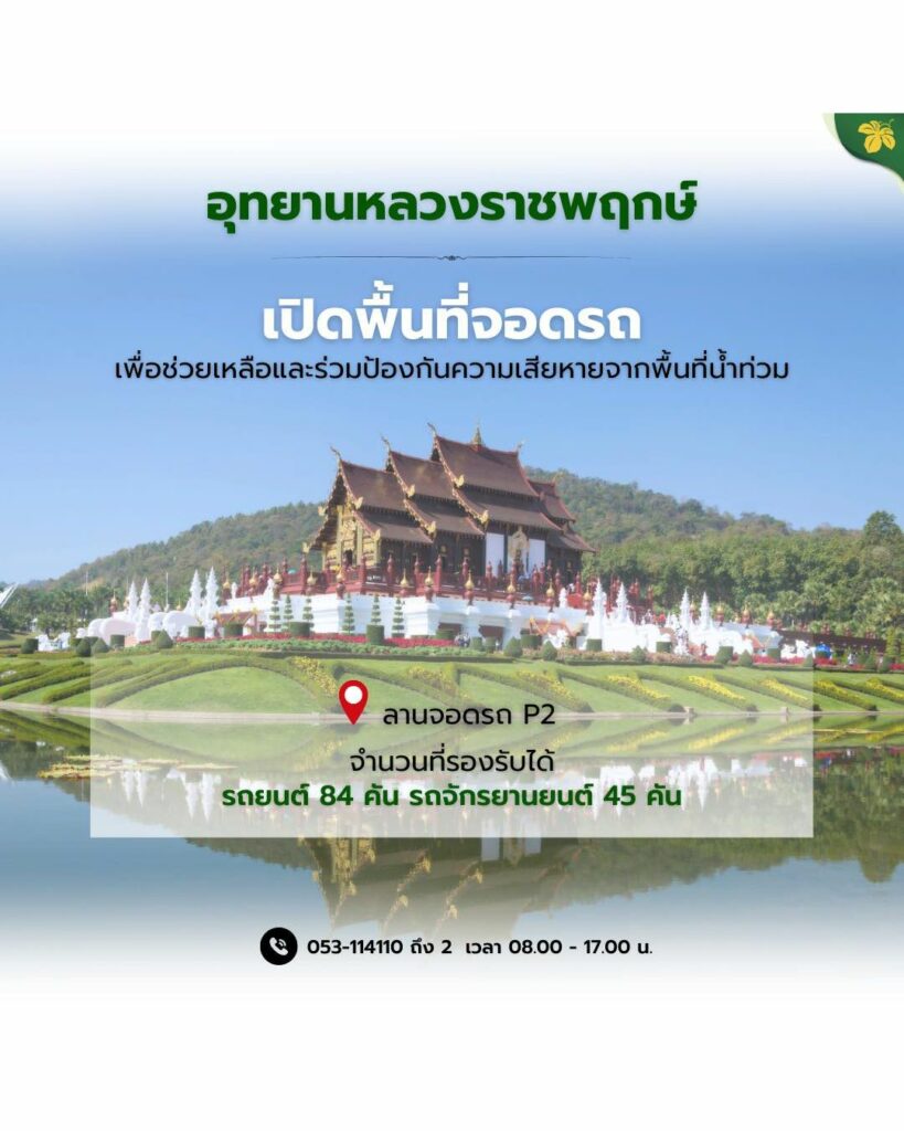 อุทยานหลวงราชพฤกษ์ เปิดพื้นที่จอดรถ โดยไม่มีค่าใช้จ่าย ช่วยเหลือและร่วมป้องกันความเสียหายจากพื้นที่น้ำท่วมในจังหวัดเชียงใหม่ ณ ลานจอดรถ P2 (เข้าประตูด้านข้างฝั่งเชียงใหม่ไนท์ซาฟารี)
