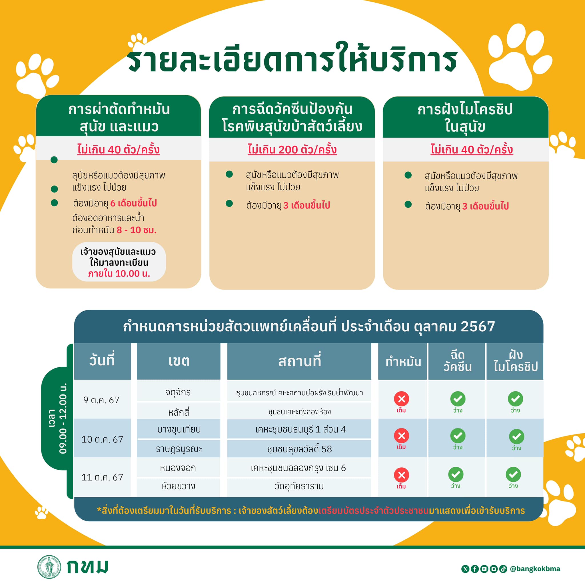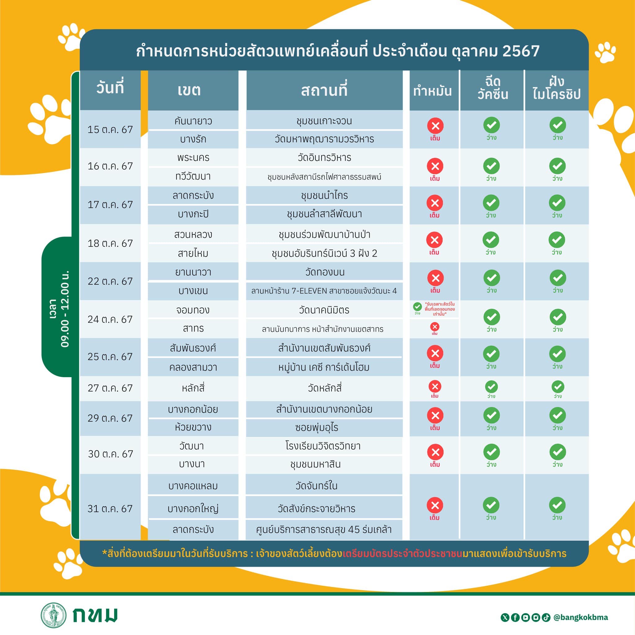 สำนักอนามัย กรุงเทพมหานคร ออกหน่วยสัตวแพทย์เคลื่อนที่ วันที่ 9 – 31 ตุลาคม 2567 เวลา 09.00 – 12.00 น.