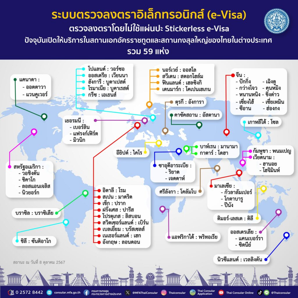 กรมการกงสุล เปิดให้บริการระบบตรวจลงตราอิเล็กทรอนิกส์ (e-Visa) รวม 59 แห่ง ข่าวสารกิจกรรม กรมการกงสุล เปิดให้บริการระบบตรวจลงตราอิเล็กทรอนิกส์ (e-Visa) รวม 59 แห่ง กรมการกงสุล กระทรวงการต่างประเทศ ได้เปิดให้บริการระบบตรวจลงตราอิเล็กทรอนิกส์ (e-Visa) ณ สถานเอกอัครราชทูตและสถานกงสุลใหญ่ไทยในต่างประเทศ ปัจจุบันรวม 59 แห่ง โดยชาวต่างชาติที่อยู่ในประเทศหรือดินแดน/เขตอาณา/จุดติดต่อที่สถานเอกอัครราชทูตและสถานกงสุลใหญ่ดังกล่าวตั้งอยู่ สามารถขอรับการตรวจลงตราผ่านระบบ e-Visa ได้ที่ www.thaievisa.go.th ที่มา : https://citly.me/NVK4i Post Views: 15 FacebookFacebookXTwitterLINELine