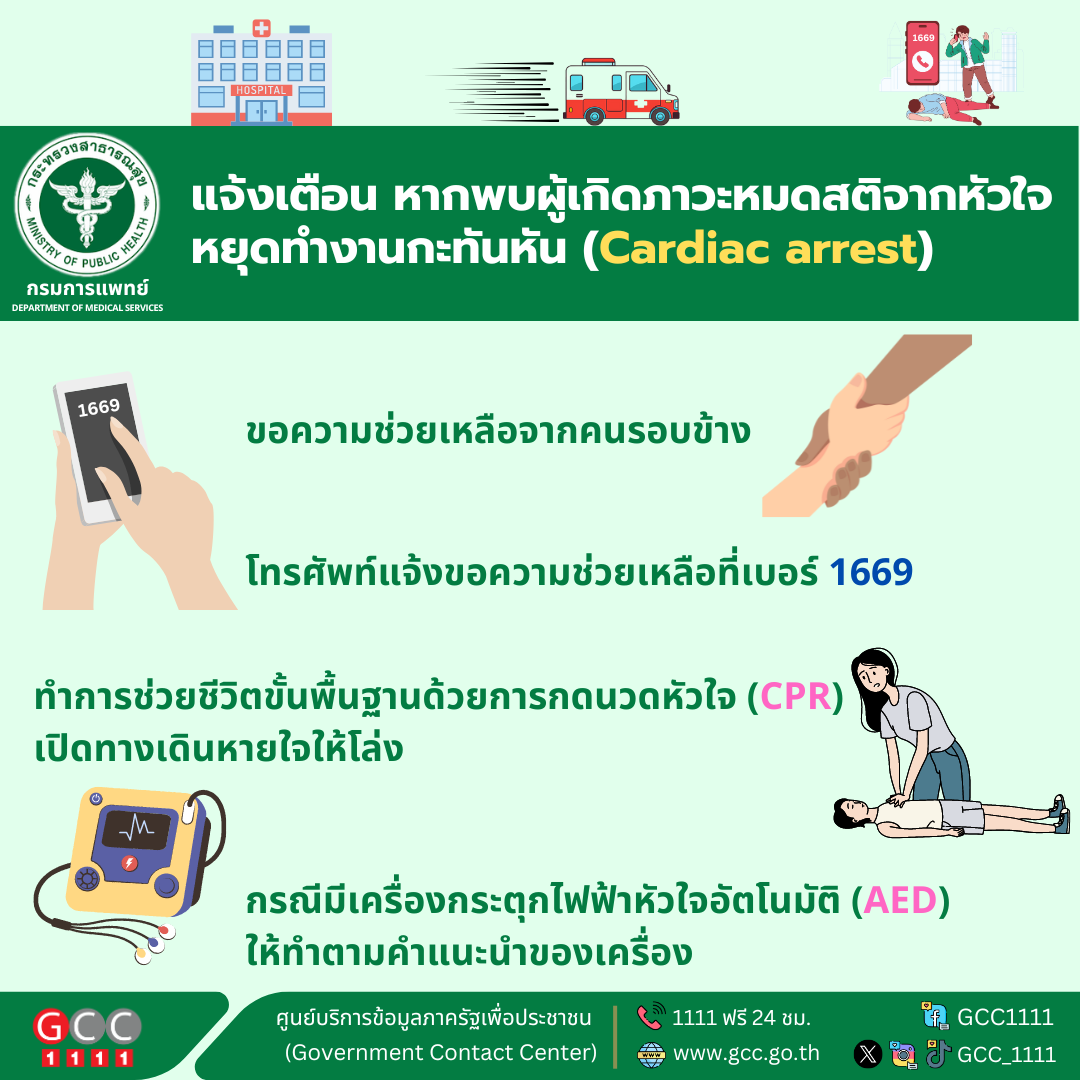 กรมการแพทย์ โดยสถาบันโรคทรวงอกแนะนำ หากพบผู้เกิดภาวะหมดสติจากหัวใจหยุดทำงานกะทันหัน (Cardiac arrest) สามารถช่วยเหลือเบื้องต้น โดยโทรแจ้งหน่วยกู้ชีพ 1669 และทำการช่วยชีวิตขั้นพื้นฐาน (Basic Life Support , BLS) ร่วมกับใช้เครื่องกระตุกไฟฟ้าหัวใจอัตโนมัติ (Automated External Defibrillator , AED)ในระหว่างรอหน่วยกู้ชีพมาถึง