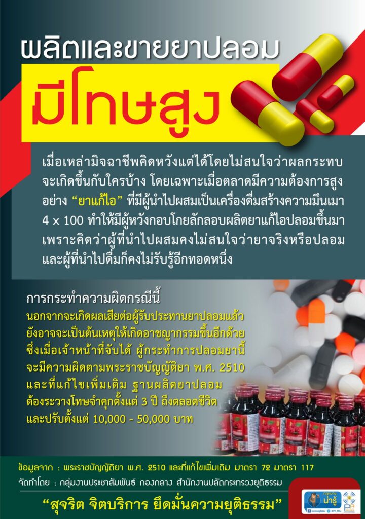 - กระทรวงยุติธรรม แจ้งเตือนการผลิตและขายยาปลอม มีโทษตามความผิดตามพระราชบัญญัติยา ดังนี้