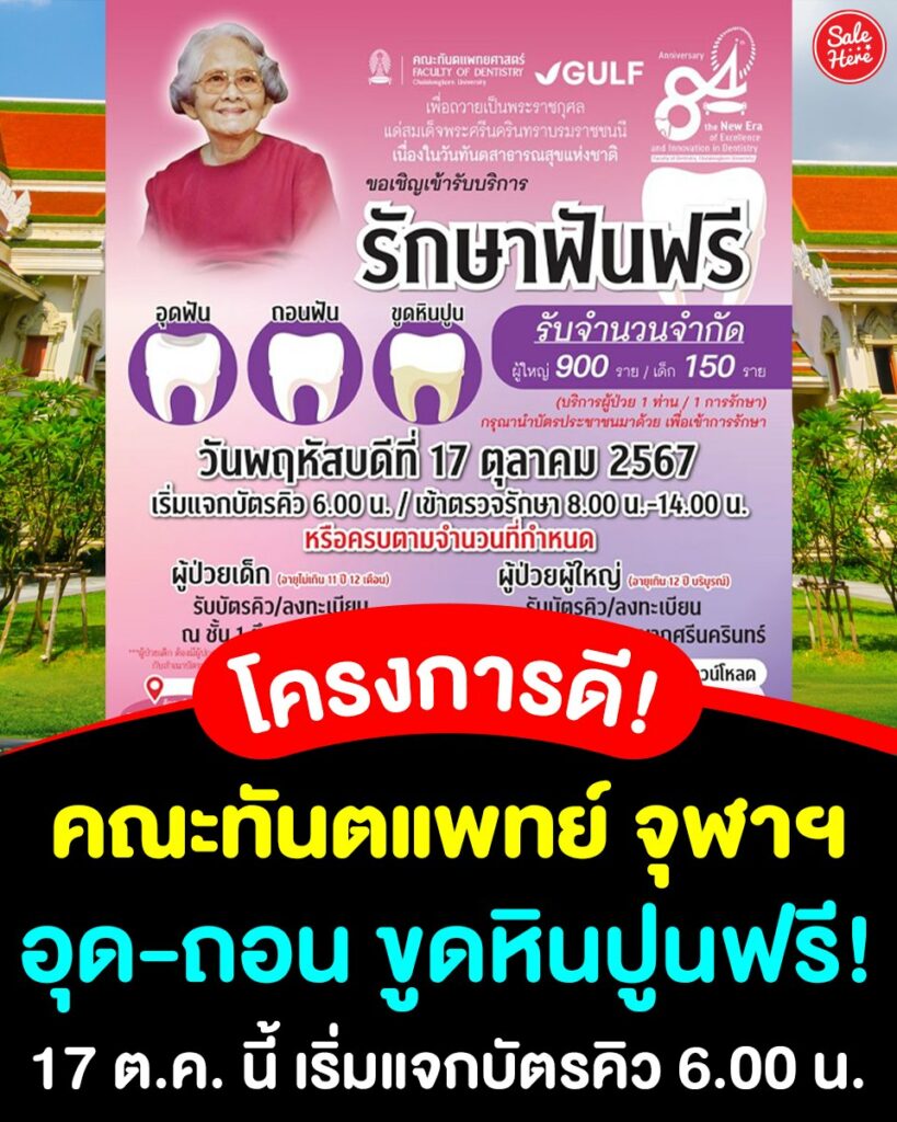 คณะทันตแพทยศาสตร์ จุฬาลงกรณ์มหาวิทยาลัย จัดโครงการ “รักษาฟัน อุด – ถอน ขูดหินปูน ฟรี” เพื่อถวายเป็นพระราชกุศล แด่สมเด็จพระศรีนครินทราบรมราชชนนี และเนื่องในวันทันตสาธารณสุขแห่งชาติ วันพฤหัสบดีที่ 17 ตุลาคม 2567 ณ อาคารบรมนาถศรีนครินทร์ คณะทันตแพทยศาสตร์ จุฬาลงกรณ์มหาวิทยาลัย รับจำนวนจำกัด ผู้ใหญ่ 900 คน และเด็ก 150 คน เริ่มแจกบัตรคิว เวลา 6.00 น. และเข้าตรวจรักษา เวลา 8.00 – 14.00 น. ใช้บัตรประชาชนใบเดียว