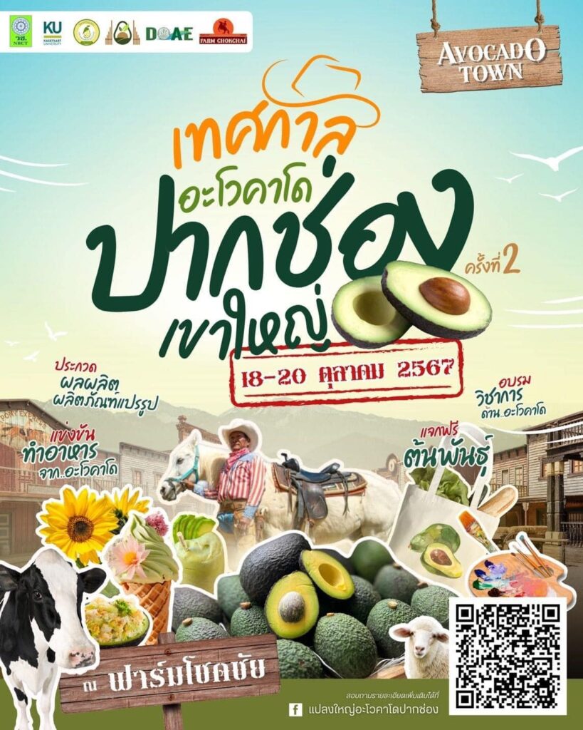 การท่องเที่ยวแห่งประเทศไทย เชิญเที่ยวงานงานเทศกาลอะโวคาโดปากช่องเขาใหญ่ ครั้งที่ 2 สัมผัสประสบการณ์สุดฟิน ด้วยอะโวคาโดอร่อยๆ ท่ามกลางบรรยากาศคาวบอยคันทรี ช้อปเพลิน ชิมอร่อย ชิลกับงานศิลป์ ในวันที่ 18 – 20 ตุลาคม 2567 ณ ฟาร์มโชคชัย อำปากช่อง จังหวัดนครราชสีมา