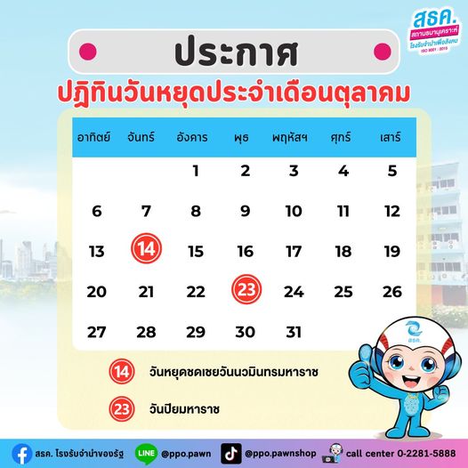 สถานธนานุเคราะห์ โรงรับจำนำของรัฐ แจ้งวันหยุดประจำเดือนตุลาคม 2567