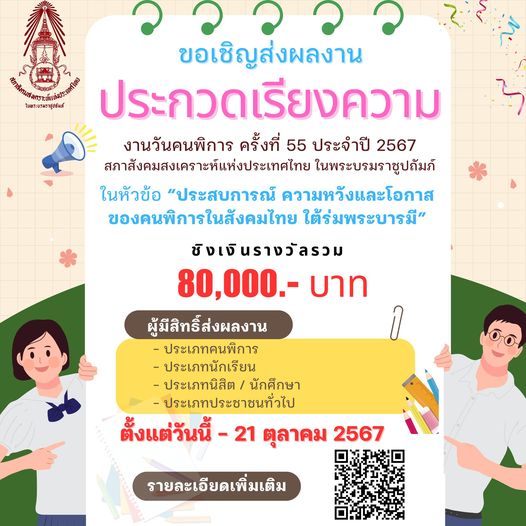 สภาสังคมสงเคราะห์ฯ ขอเชิญส่งผลงานเข้าร่วมประกวดเรียงความ งานวันคนพิการ ครั้งที่ 55 ประจำปี 2567 ในหัวข้อ “ประสบการณ์ ความหวังและโอกาสของคนพิการในสังคมไทย” ชิงเงินรางวัลรวม 80,000 บาท