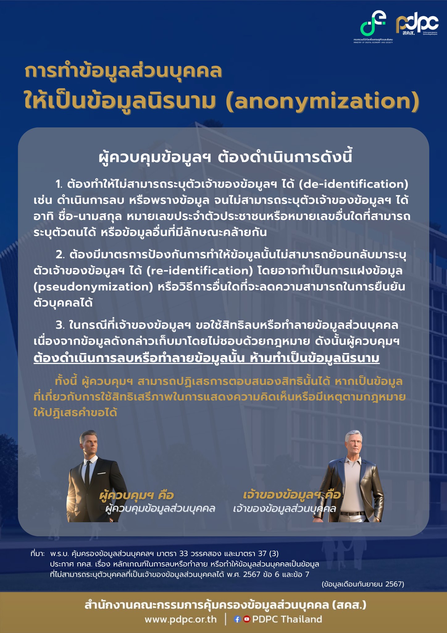 ที่มา: พ.ร.บ. คุ้มครองข้อมูลส่วนบุคคลฯ มาตรา 33 วรรคสอง และมาตรา 37 (3) ประกาศ กคส. เรื่อง หลักเกณฑ์ในการลบหรือทําลาย หรือทําให้ข้อมูลส่วนบุคคลเป็นข้อมูล ที่ไม่สามารถระบุตัวบุคคลที่เป็นเจ้าของข้อมูลส่วนบุคคลได้ พ.ศ. 2567 ข้อ 6 และข้อ 7