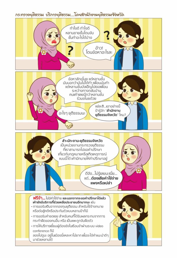 กระทรวงยุติธรรม นำเสนอสื่อความรู้กฎหมาย ฉบับบการ์ตูน แปล 3 ภาษา (ไทย มาเลย์ มลายู) เพื่อให้ประชาชนได้เข้าถึงองค์ความรู้กฎหมายที่จำเป็น พร้อมรับทราบช่องทางขอรับความช่วยเหลือและงานบริการของกระทรวงยุติธรรม ศูนย์ยุติธรรมชุมชนและหน่วยงานในกระบวนการยุติธรรม ในพื้นที่จังหวัดชายแดนภาคใต้