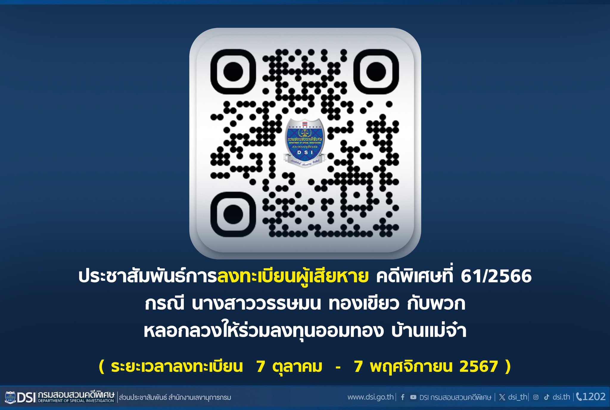 DSI ประชาสัมพันธ์การลงทะเบียนผู้เสียหาย คดีพิเศษที่ 61/2566 กรณี นางสาววรรษมน ทองเขียว กับพวก หลอกลวงให้ร่วมลงทุนออมทอง บ้านแม่จ๋า โดยมีพฤติการณ์ โฆษณาชักชวนประชาชน ผ่านสื่อออนไลน์ Facebook อันอาจเป็นความผิดฐานกู้ยืมเงินที่เป็นการฉ้อโกงประชาชน พ.ศ.2527 และแก้ไขเพิ่มเติมและความผิดอื่นที่เกี่ยวข้อง