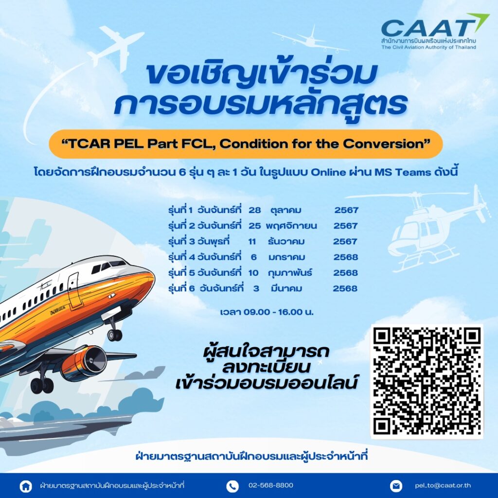 สำนักงานการบินพลเรือนแห่งประเทศไทย จัดอบรมหลักสูตร TCAR PEL Part FCL, Condition for the Conversion เพื่อให้การพัฒนาคุณสมบัติของผู้ประจำหน้าที่นักบินเป็นไปตามข้อกำหนดของสำนักงานการบินพลเรือนแห่งประเทศไทย ฉบับที่ 48 ว่าด้วยใบอนุญาตผู้ประจำหน้าที่นักบิน และเป็นการให้การสนับสนุนผู้ประจำหน้าที่ฯ ได้มีโอกาสศึกษาและเรียนรู้กฎระเบียบฯ ตลอดจนเพิ่มช่องทางการเข้าถึงระเบียบข้อกำหนดฯ TCAR PEL part FCL Requlation ได้มากขึ้น