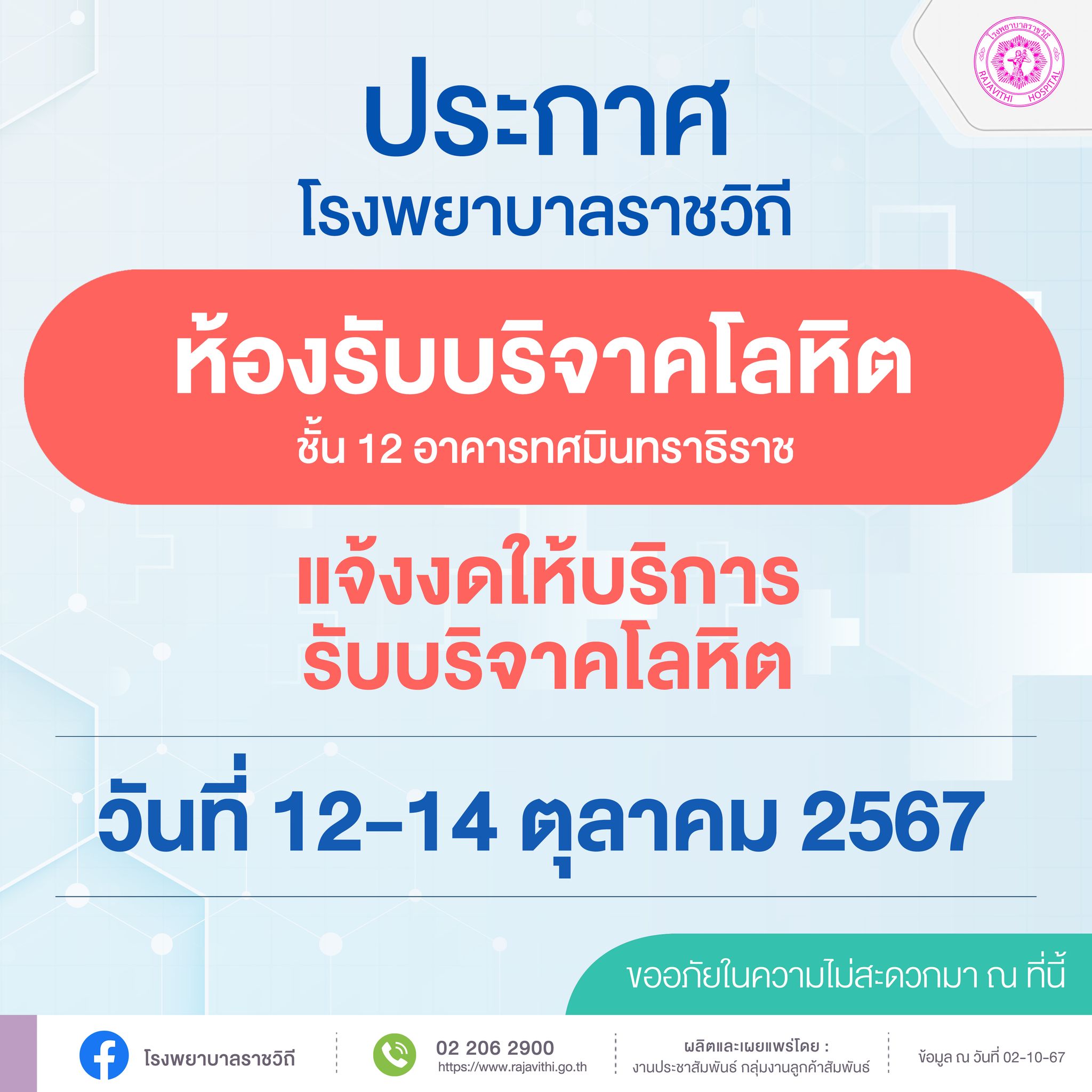 โรงพยาบาลราชวิถี กรมการแพทย์ ประกาศแจ้ง “ห้องรับบริจาคโลหิต” งดให้บริการรับบริจาคโลหิต วันที่ 12 – 14 ตุลาคม 2567 ณ ชั้น 12 อาคารทศมินทราธิราช