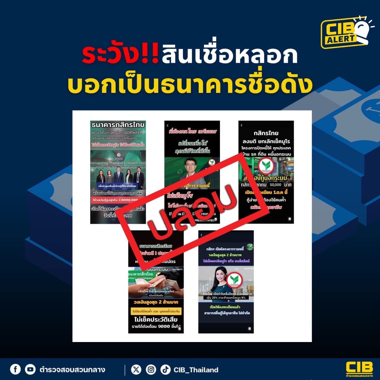 กองบัญชาการตำรวจสอบสวนกลาง แจ้งเตือนระวัง สินเชื่อหลอก บอกเป็นธนาคารชื่อดัง โดยอ้างโฆษณาเชิญชวนให้เข้าโครงการปล่อยสินเชื่อไม่เช็กบูโร สามารถยกเลิก Blacklist ไม่ใช้คนค้ำ พร้อมให้ลงทะเบียนฟรี สมัครฟรี จึงขอเตือนว่าทางธนาคารกสิกรไทยไม่มีโครงการดังกล่าวข้างต้น ทั้งนี้ลูกค้าสามารถติดตามข้อมูลผลิตภัณฑ์ บริการ แคมเปญต่างๆ ได้จากช่องทาง official ของธนาคารเท่านั้น ซึ่งช่องทางจริงของ KBank บน TikTok สามารถสังเกตได้ดังนี้ ชื่อบัญชีทางการ KBank Live, มีเครื่องหมายติ๊กถูกสีฟ้า หลังชื่อ @kbank Live, มีผู้ติดตาม 1.2 M (ข้อมูล ณ ต.ค.2567) หากถูกหลอกลวงให้โอนเงิน หรือต้องการปรึกษาปัญหาอาชญากรรมออนไลน์ หรือติดตามคดี สามารถติดต่อได้ที่ สายด่วนศูนย์ AOC โทรเบอร์ 1441 ตลอด 24 ชั่วโมง