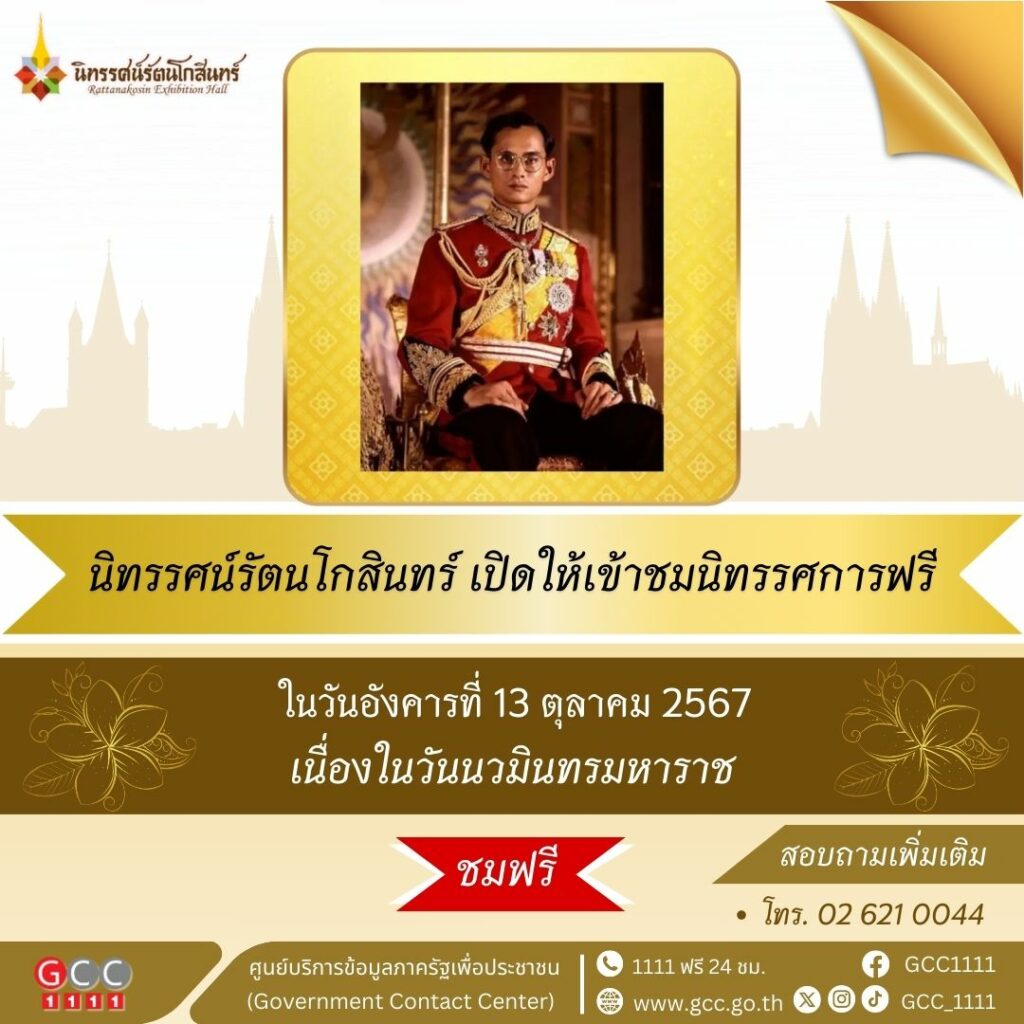 - นิทรรศน์รัตนโกสินทร์ เปิดให้เข้าชมนิทรรศการฟรี ในวันอังคารที่ 13 ตุลาคม 2567 เนื่องในวันนวมินทรมหาราช ทั้งนี้ สามารถสอบถามเพิ่มเติมได้ที่ โทร. 0 2621 0044