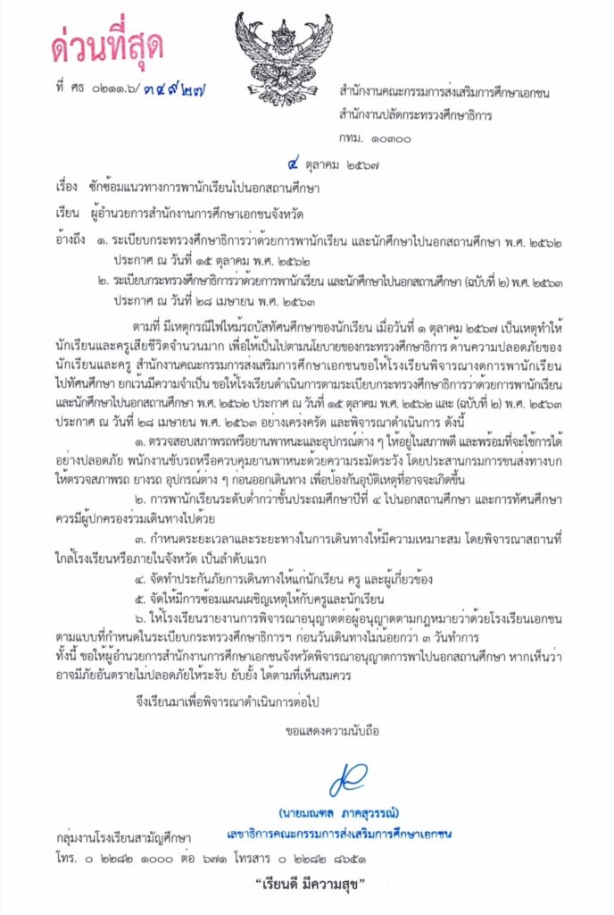 สช. ประกาศ 6 แนวทางการพานักเรียนไปนอกสถานศึกษา ของสถานศึกษาเอกชนทั่วประเทศ