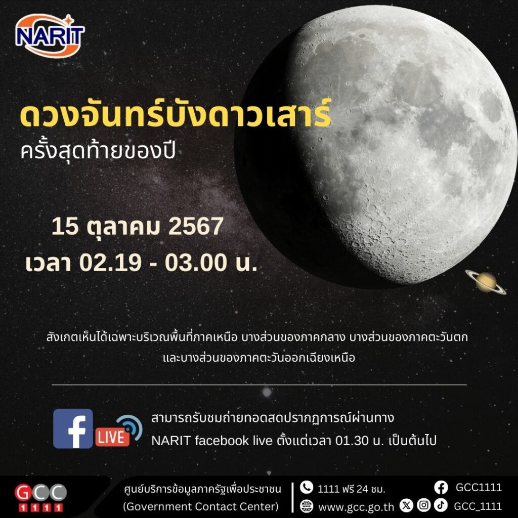 NARIT เปิดเผย ช่วงก่อนรุ่งเช้า วันที่ 15 ตุลาคม 2567 จะเกิดปรากฏการณ์ดวงจันทร์บังดาวเสาร์