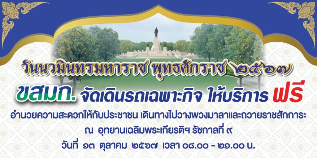นายกิตติกานต์ จอมดวง จารุวรพลกุล ผู้อำนวยการองค์การขนส่งมวลชนกรุงเทพ เปิดเผยว่า สำนักพระราชวัง เปิดให้ประชาชนเดินทางมาวางพวงมาลา และถวายราชสักการะ เพื่อน้อมรำลึก ในพระมหากรุณาธิคุณพระบาทสมเด็จพระบรมชนกาธิเบศร มหาภูมิพลอดุลยเดชมหาราช บรมนาถบพิตร เนื่องใน “วันนวมินทรมหาราช” พุทธศักราช 2567 วันที่ 13 ตุลาคม 2567 ณ บริเวณพระบรมราชานุสาวรีย์ อุทยานเฉลิมพระเกียรติฯ รัชกาลที่ 9 เขตดุสิต กรุงเทพมหานคร ขสมก. จึงจัดเดินรถโดยสารธรรมดา วิ่งให้บริการฟรี ในเส้นทางเดินรถเฉพาะกิจ (จอดรับ – ส่งทุกป้าย) จำนวน 2 เส้นทาง เพื่ออำนวย ความสะดวกให้กับประชาชน เดินทางมาวางพวงมาลาและถวายราชสักการะ ณ อุทยานเฉลิมพระเกียรติฯ รัชกาลที่ 9 โดยจอดรับ – ส่ง บริเวณประตูทางเข้าอุทยานเฉลิมพระเกียรติฯ ฝั่งถนนพระรามที่ 5