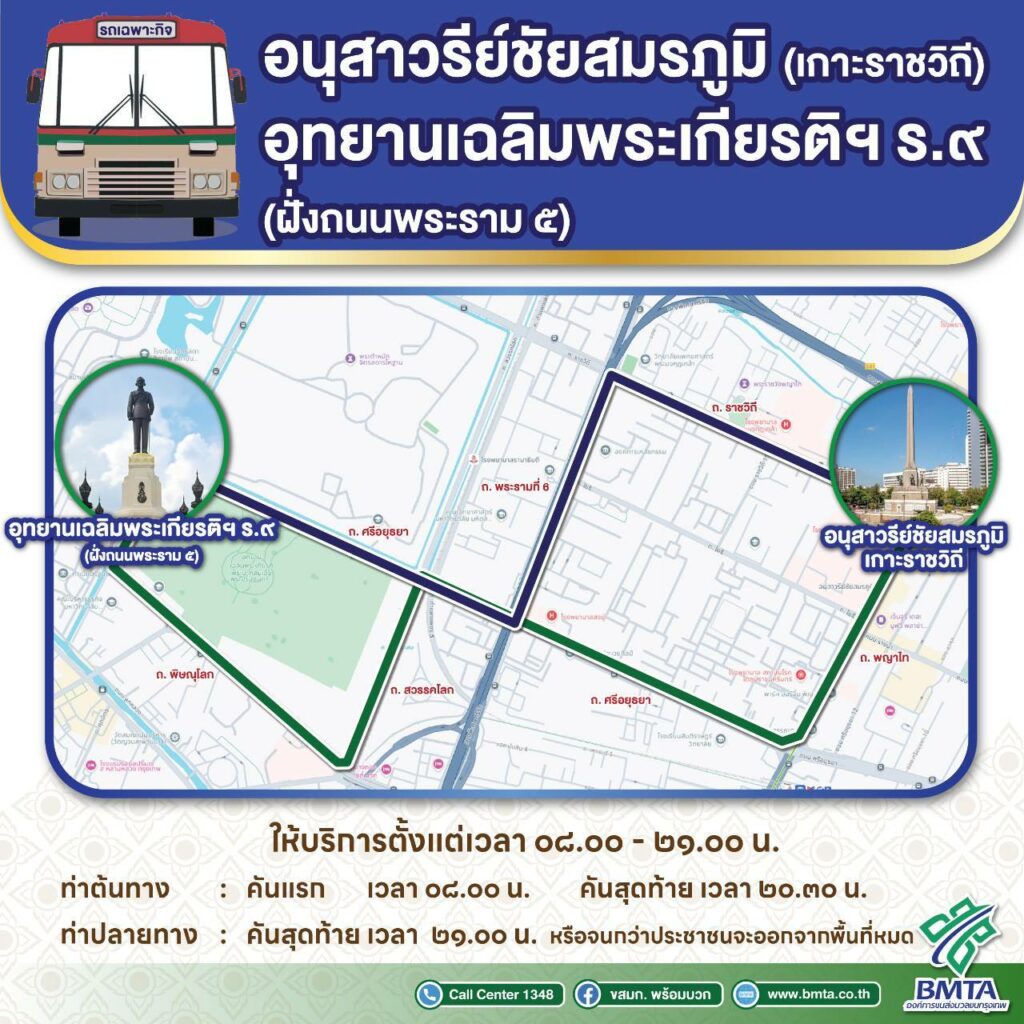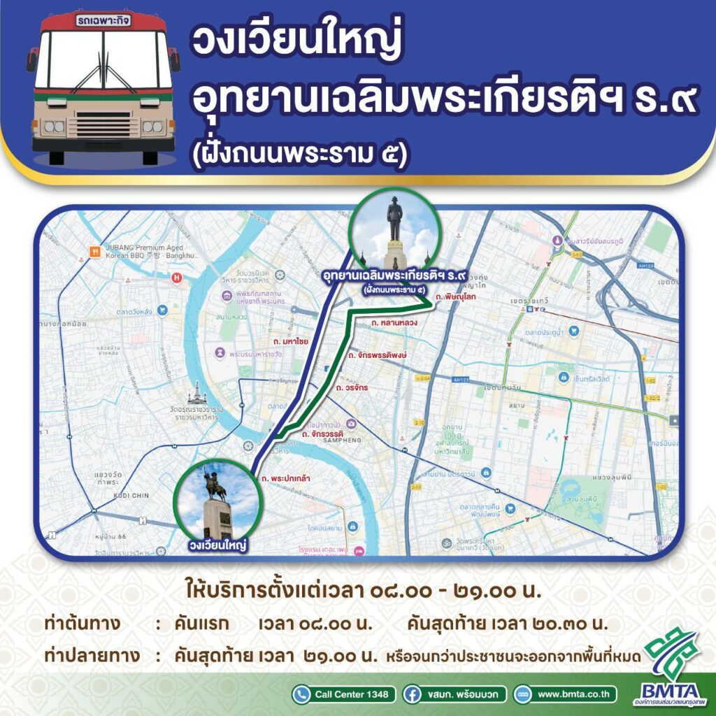 องค์การขนส่งมวลชนกรุงเทพ จัดเดินรถเฉพาะกิจ ให้บริการฟรี 2 เส้นทาง เพื่ออำนวยความสะดวกให้กับประชาชนเดินทางมาวางพวงมาลาและถวายราชสักการะ เนื่องในวัน “นวมินทรมหาราช”พุทธศักราช 2567 ในวันที่ 13 ตุลาคม 2567 ณ บริเวณพระบรมราชานุสาวรีย์ อุทยานเฉลิมพระเกียรติฯ รัชกาลที่ 9 เขตดุสิต กรุงเทพมหานคร