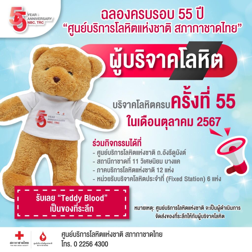 สภากาชาดไทย ขอเชิญร่วมฉลองครบรอบ 55 ปี วันสถาปนา ศูนย์บริการโลหิตแห่งชาติ สภากาชาดไทย 13 ตุลาคม 2567 ผู้บริจาคโลหิต ที่บริจาคครบครั้งที่ 55 ในเดือนตุลาคม 2567 รับทันที ” Teddy Blood ” เป็นของที่ระลึก 1 ตัว/ท่าน