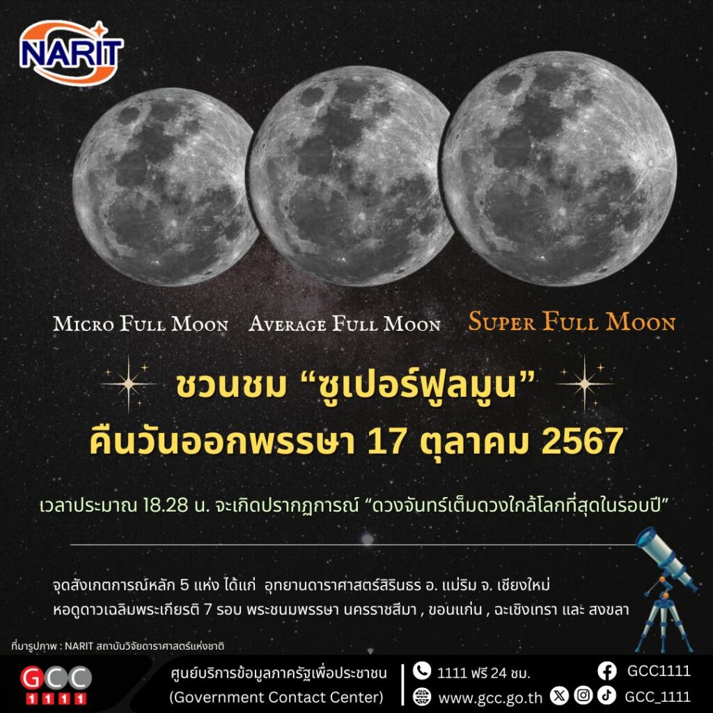 NARIT ชวนชม “ซูเปอร์ฟูลมูน” ดวงจันทร์เต็มดวงใกล้โลกที่สุดในรอบปี ในคืนออกพรรษา 17 ต.ค. 67