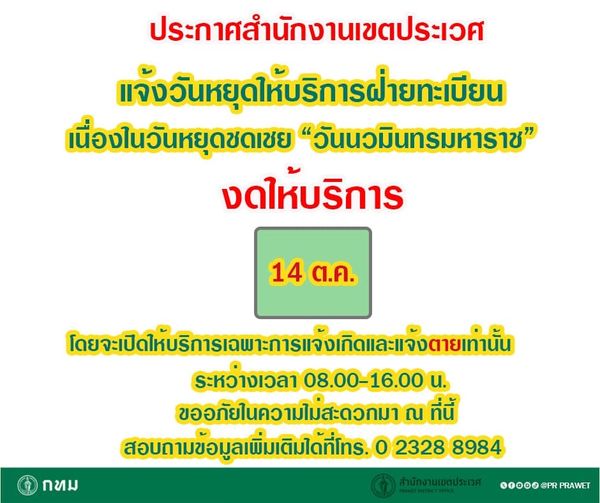 สำนักงานเขตประเวศ แจ้งงดบริการ วันที่ 14 ตุลาคม 2567 เนื่องจากเป็นวันหยุดราชการ วันหยุดชดเชยวันนวมินทรมหาราช ฝ่ายทะเบียนจะเปิดให้บริการงานทะเบียนราษฎรและงานบัตรประจำตัวประชาชน วันอังคารที่ 15 ตุลาคม 2567 เวลา 08.00-16.00 น. เป็นต้นไป สอบถามรายละเอียดเพิ่มเติมได้ที่ ฝ่ายทะเบียน สำนักงานเขตประเวศ หมายเลขโทรศัพท์ 0-2328-8984