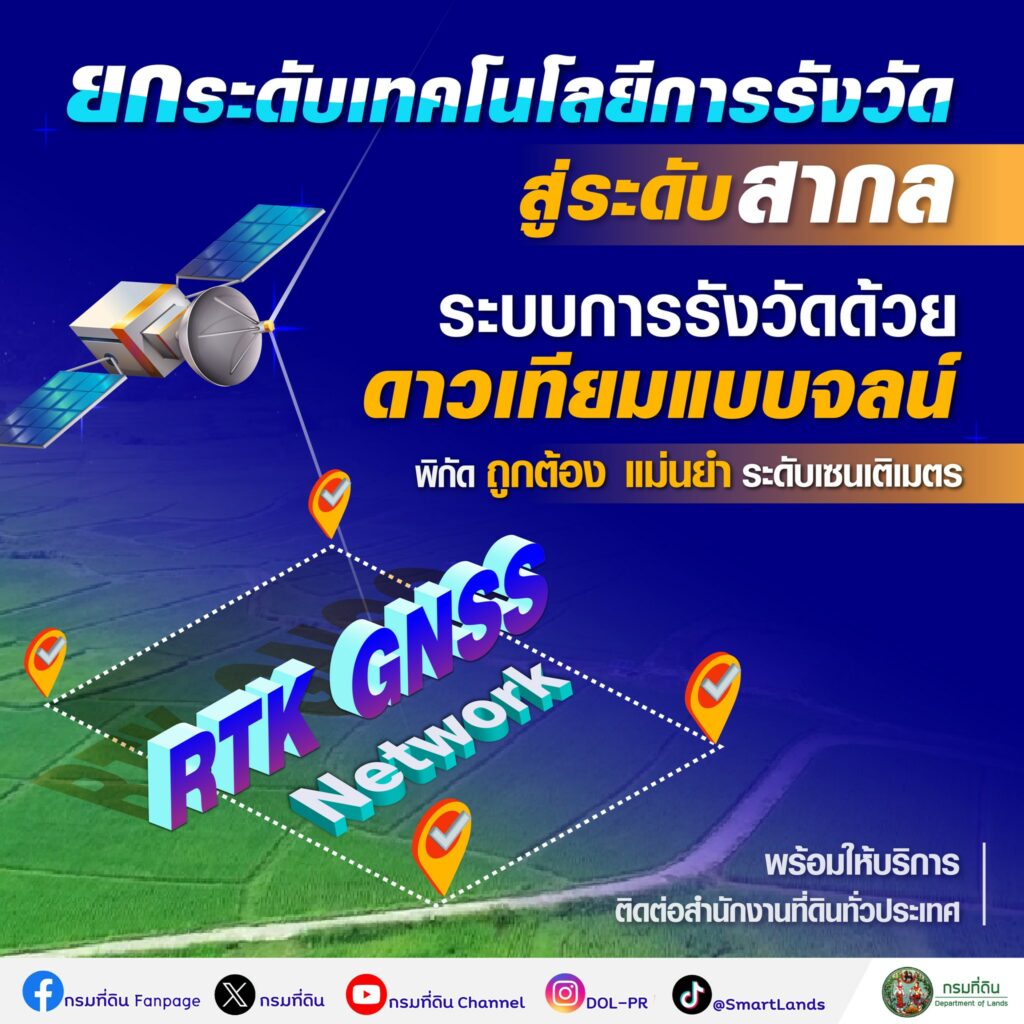 กรมที่ดิน นำเทคโนโลยีการรังวัดโดยระบบโครงข่ายการรังวัด ด้วยดาวเทียมแบบจลน์ (RTK GNSS Network) มาใช้ในการรังวัด ทำแผนที่ เพื่อให้รูปแปลงที่ดินมีค่าพิกัดภูมิศาสตร์ที่ถูกต้อง สามารถ ตรวจสอบตำแหน่งของหลักเขต หรือแนวเขตที่ดิน ในกรณีสูญหาย หรือถูกเคลื่อนย้าย ได้อย่างถูกต้อง แม่นยำ และรวดเร็ว ซึ่งเทคโนโลยีการรังวัดนี้เป็นเทคโนโลยีการรังวัดที่ทันสมัย มีความละเอียดถูกต้องสูง พร้อมให้บริการ ติดต่อสำนักงานที่ดินทั่วประเทศ