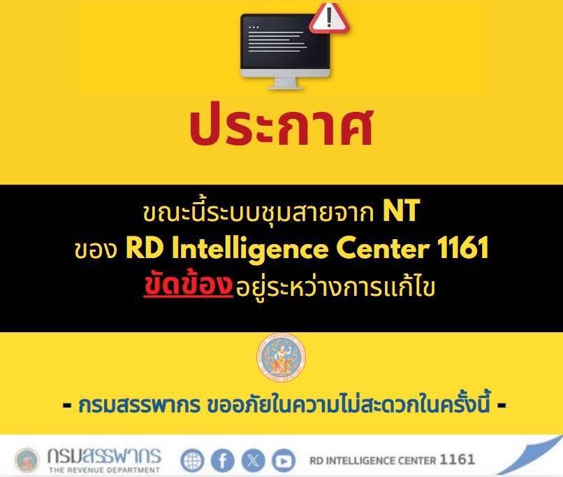 กรมสรรพากร ประกาศ ระบบชุมสายจาก NT ของ RD Intelligence Center 1161 ขัดข้องอยู่ระหว่างการแก้ไข