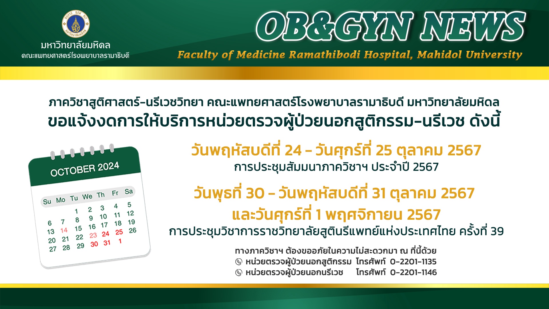 คณะแพทยศาสตร์โรงพยาบาลรามาธิบดี ขอแจ้งงดการให้บริการชั่วคราวหน่วยตรวจผู้ป่วยนอกสูติกรรม-นรีเวช ในวันที่ 24 – 25 ตุลาคม 2567, วันที่ 30 – 31 ตุลาคม 2567 และวันที่ 1 พฤศจิกายน 2567