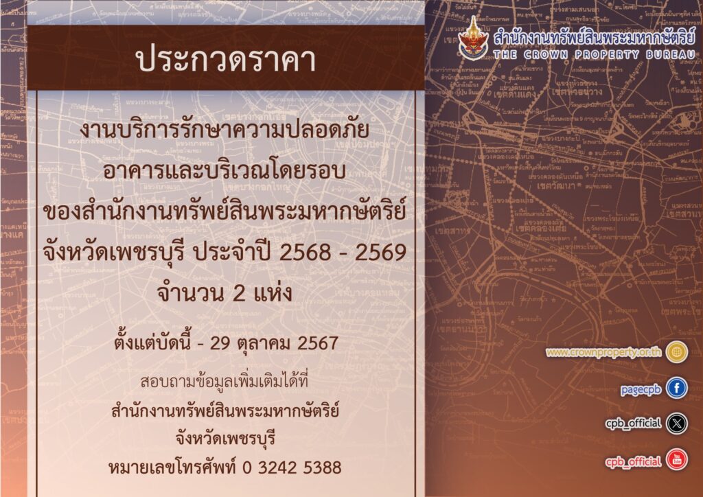 - สำนักงานทรัพย์สินพระมหากษัตริย์ เปิดประกวดราคางานบริการรักษาความปลอดภัยอาคารและบริเวณโดยรอบของสำนักงานทรัพย์สินพระมหากษัตริย์ จังหวัดเพชรบุรี ประจำปี 2568 – 2569 (นับแต่วันที่ 1 มกราคม 2568 – 31 ธันวาคม 2569) จำนวน 2 แห่ง ดังนี้