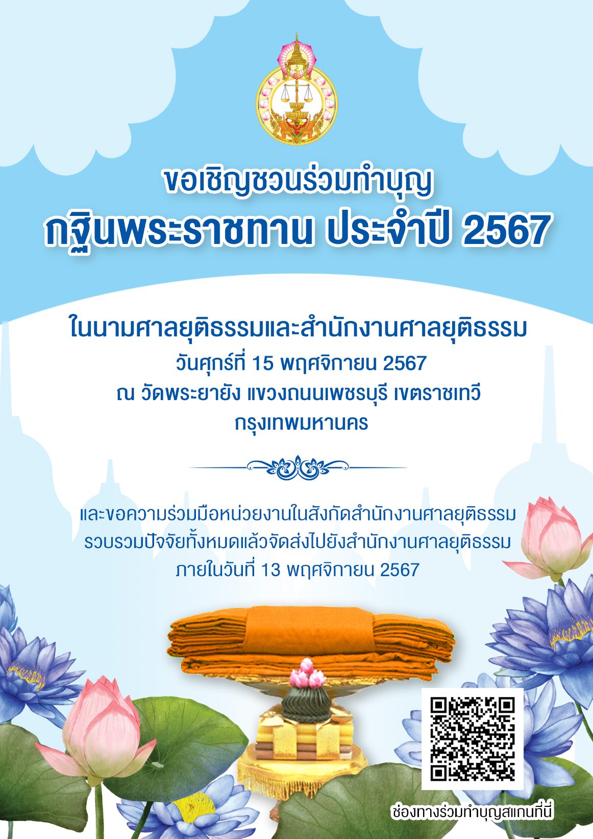 สำนักงานศาลยุติธรรม ขอเชิญชวนผู้มีจิตศรัทธาร่วมทำบุญกฐินพระราชทาน ประจำปี 2567 ในวันศุกร์ที่ 15 พฤศจิกายน 2567 ณ วัดพระยายัง แขวงถนนเพชรบุรี เขตราชเทวี กรุงเทพมหานคร และขอความร่วมมือหน่วยงานในสังกัดสำนักงานศาลยุติธรรม รวบรวมปัจจัยทั้งหมดแล้วจัดส่งไปยังสำนักงานศาลยุติธรรม ภายในวันที่ 13 พฤศจิกายน 2567
