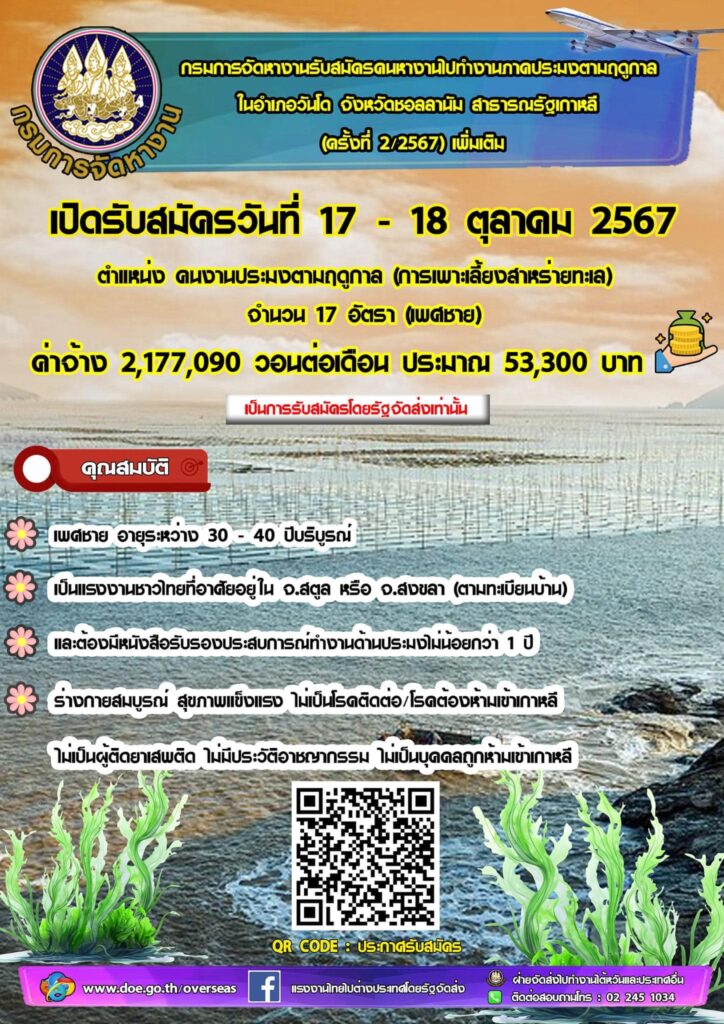 กรมการจัดหางาน เปิดรับสมัครคนหางานไปทำงานภาคประมงตามฤดูกาล ในอำเภอวันโด จังหวัดชอลลานัม สาธารณรัฐเกาหลี (ครั้งที่ 2/2567)
