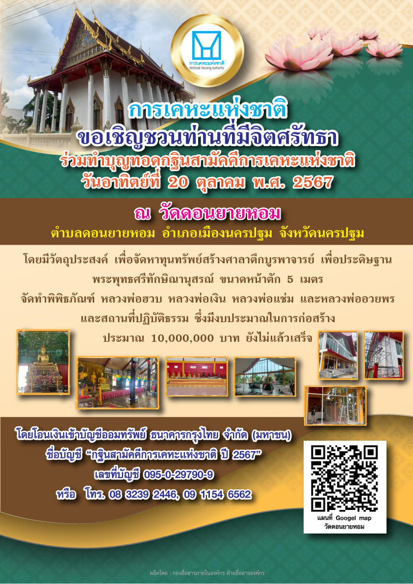 การเคหะแห่งชาติ ขอเชิญชวนท่านที่มีจิตศรัทธา ร่วมทำบุญทอดกฐินสามัคคีการเคหะแห่งชาติ วันที่ 20 ตุลาคม 2567 ณ วัดดอนยายหอม ตำบลดอนยายหอม อำเภอเมืองนครปฐม จังหวัดนครปฐม