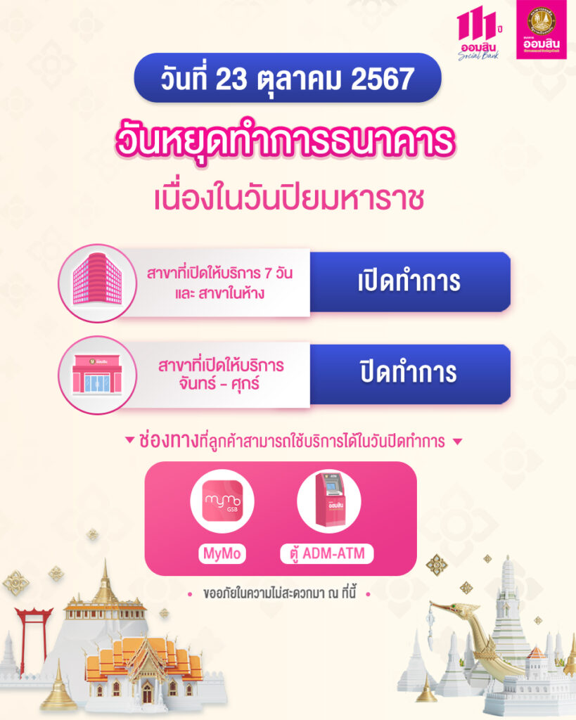 ธนาคารออมสิน แจ้งวันหยุดทำการธนาคารออมสิน วันที่ 23 ตุลาคม 2567 เนื่องในวันปิยมหาราช